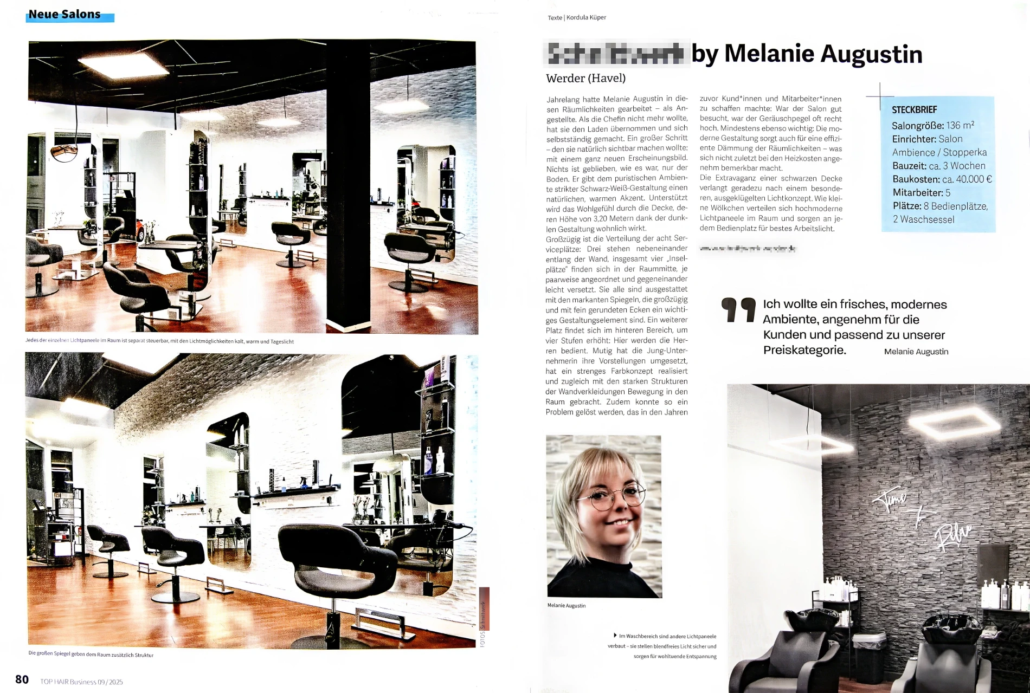 Melanie war genauso überrascht wie erfreut über den Anruf des Redakteurs von Top Hair (www.tophair.de), dem Magazin was Sie selbst seit Jahren liest. Nun sollte ihr eigener Salon darin vorgestellt werden! Nach einem Vor-Ort Besuch des Redakteurs war es in der Juni Ausgabe endlich soweit – ihr Friseur Salon wurde in der Top Hair vorgestellt und in höchsten Tönen gelobt. Leider ist der Artikel hinter einer Paywall, aber wir teilen ihn gerne mit euch.